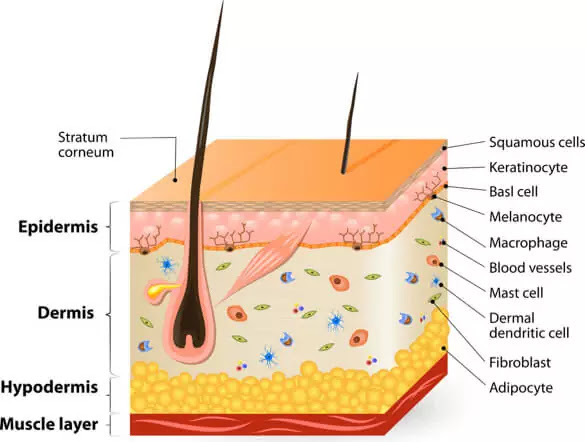 The human skin is divided into three layers: epidermis, dermis and hypodermis.